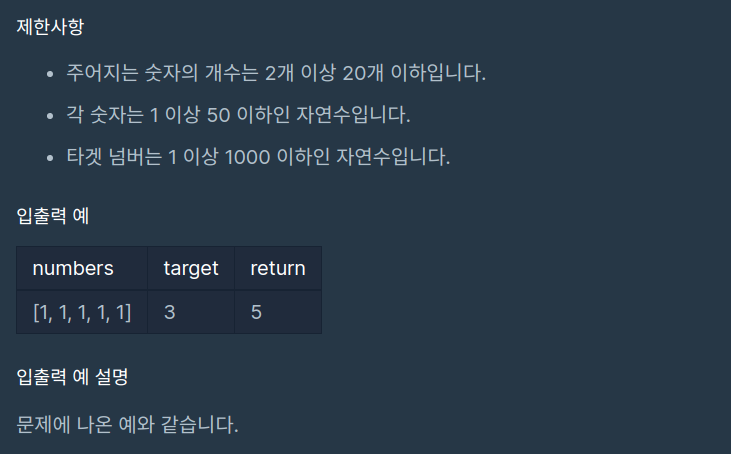 n개의 음이 아닌 정수가 있습니다. 이 수를 적절히 더하거나 빼서 타겟 넘버를 만들려고 합니다. 예를 들어 [1, 1, 1, 1, 1]로 숫자 3을 만들려면 다음 다섯 방법을 쓸 수 있습니다. -1+1+1+1+1 = 3 +1-1+1+1+