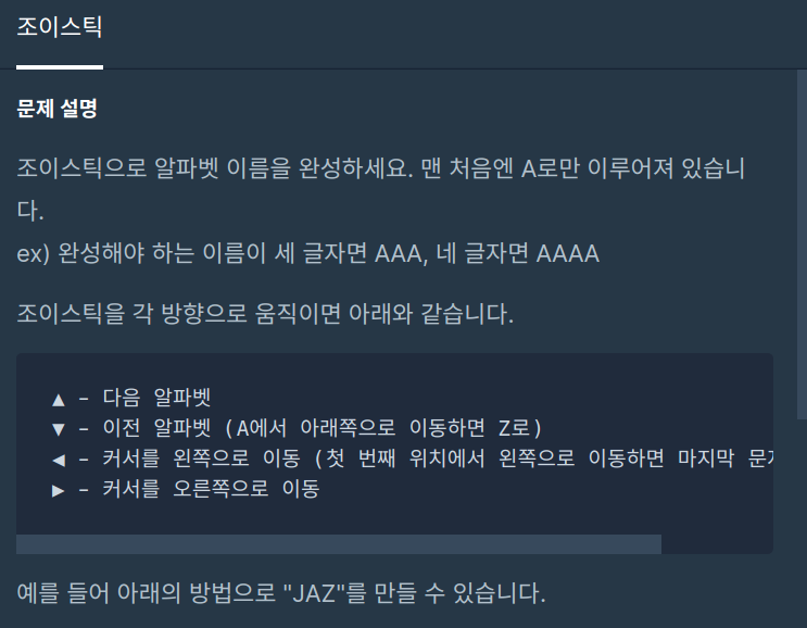 조이스틱으로 알파벳 이름을 완성하세요. 맨 처음엔 A로만 이루어져 있습니다. ex) 완성해야 하는 이름이 세 글자면 AAA, 네 글자면 AAAA 조이스틱을 각 방향으로 움직이면 아래와 같습니다. ▲ - 다
