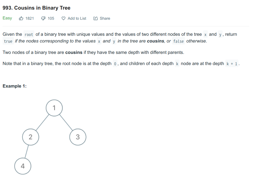 매개변수로 오는 x,y의 값을 가진 노드가 서로 cousine이면 true를 리턴, 다르면 false를 리턴.