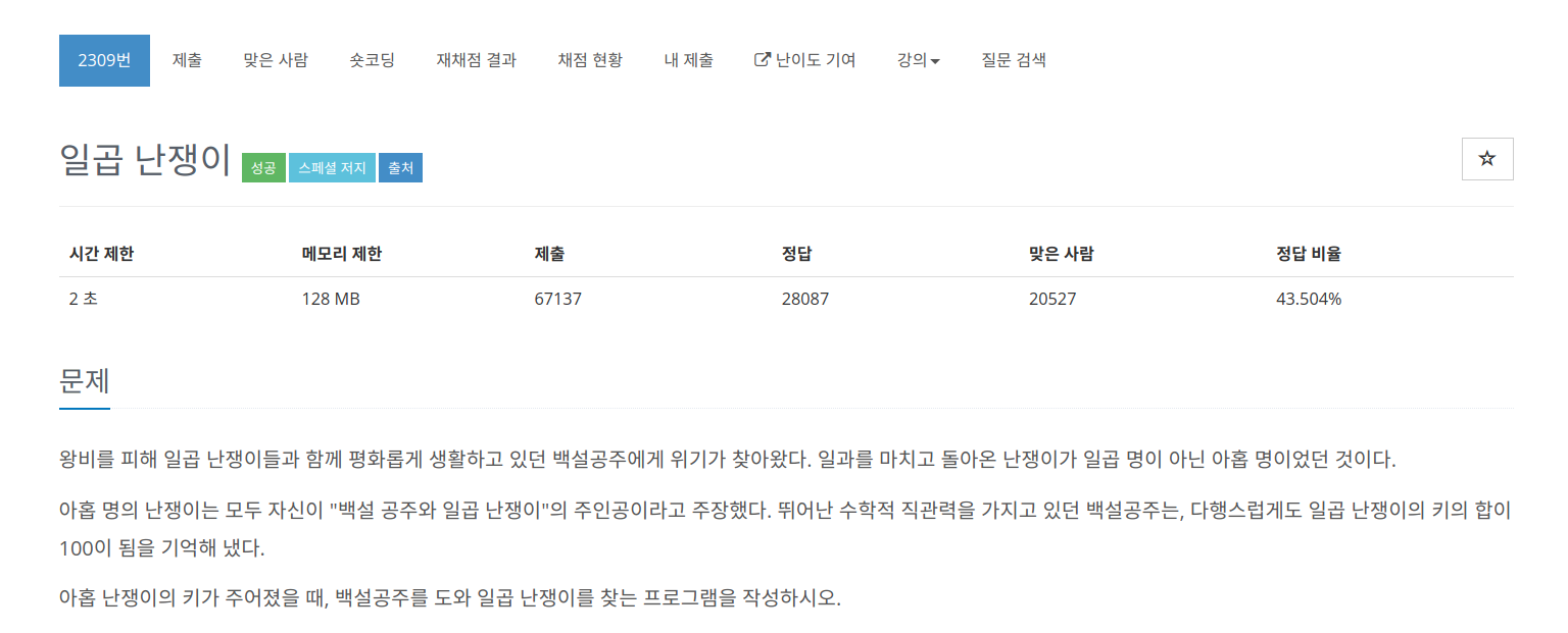2309번: 일곱 난쟁이