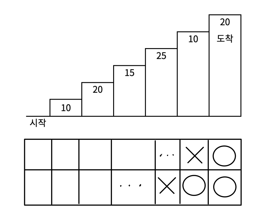 마지막 계단은 무조건 밟아야 하는 조건이 있으므로 마지막 계단은 O처리를 했고, 나머지 앞에 올 수 있는 모든 조건을 다 썼다.