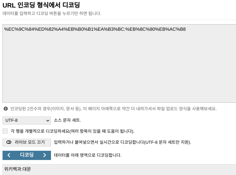 실제로 URL 디코더 사이트에서 퍼센트가 들어간 문자열을 디코딩하면 원래 문자열이 나오는 것을 볼 수 있습니다.