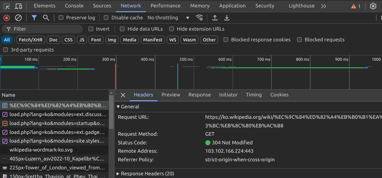 웹브라우저에선 URL에 아스키 코드가 아닌 문자열이 포함된다면 이 주소를 퍼센티지 인코딩을 통해 변환합니다. 그리고 변환된 주소를 통해 요청을 보냅니다. 이를 육안으로 확인하고 싶다면 크롬 개발자 도구를 F12를 눌러서 켜고 네트워크에서 Request URL에서 헤더를 확인해봅시다. 나무위키 대문으로 요청을 보내지 않고 인코딩된 주소로 요청하는 것을 볼 수 있습니다.