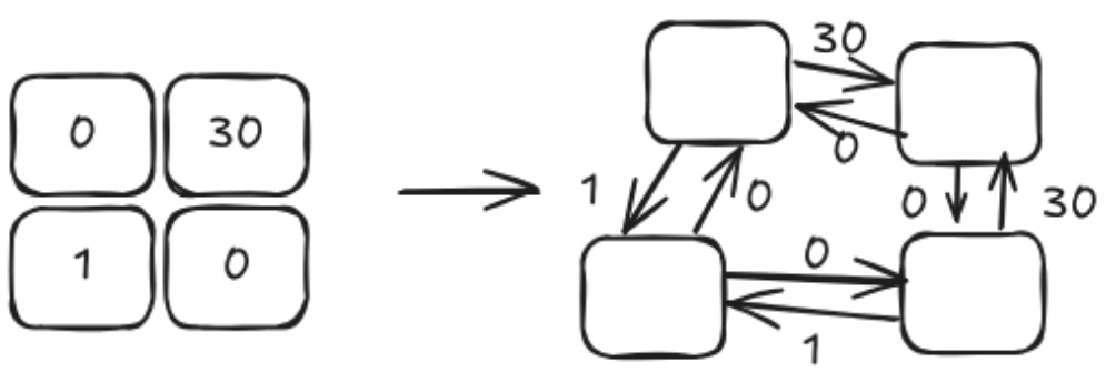 지도의 위치가 노드이며 복구 시간은 해당 노드로 이어진 간선의 가중치다.
