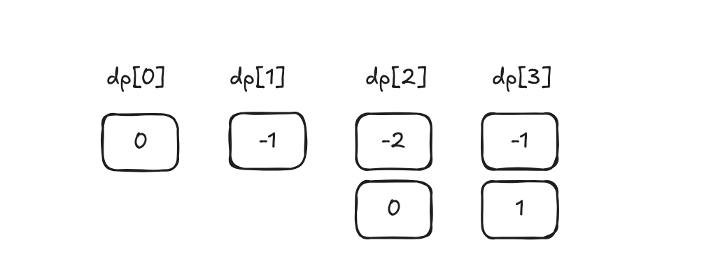 기존 완전탐색 방법에 의하면 두 가지 모든 경우를 넣는다. 그러므로 -1 기준 좌우인 [-2, 0]과 1 기준 좌우인 [0, 2]가 모두 들어가서 최종적으로 dp[4]는 [-2, 0, 0, 2]가 들어간다.그러나, 딱 봐도 중복은 의미가 없다. 몇 번을 뽑았든 현재 위치가 거기라면 탐색을 나눠서 할 필요가 없다.
