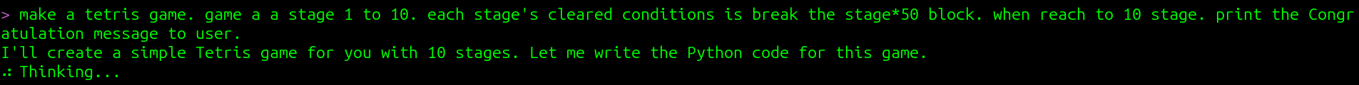 “간단한 테트리스 게임을 만들어줘”라고 입력하자, 실제로 코드를 생성하고 실행 환경까지 자동으로 구성해주었습니다.