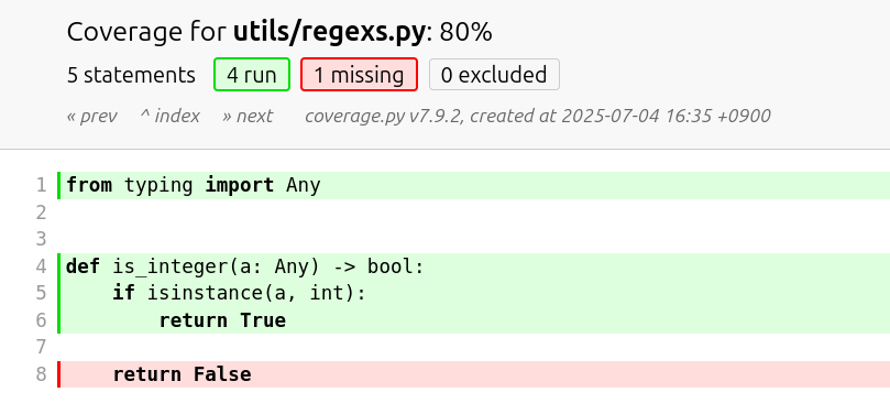 utils/regexs.py 테스트에 1줄이 실행되지 않은 것을 확인할 수 있습니다.
