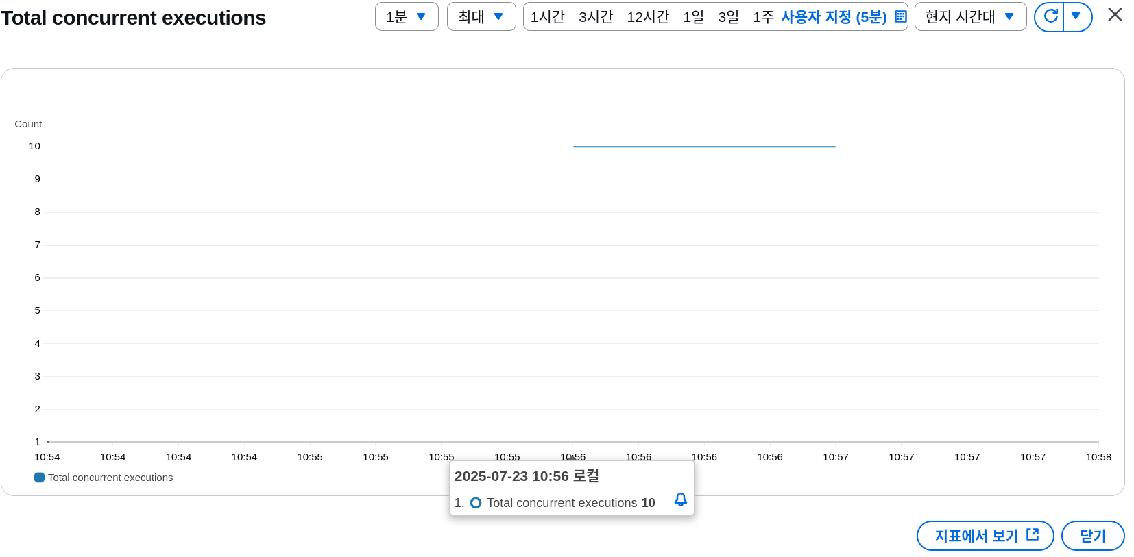 함수의 ConcurrentExecutions 메트릭을 확인해보니, 동시 실행 수가 정확히 10에서 멈춰 있다.