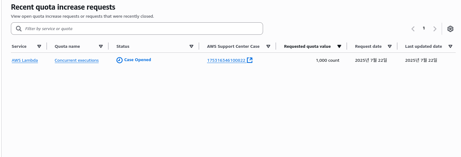 AWS 콘솔에서 Lambda 동시성 제한 상향 요청을 제출하여 최대 동시성을 1000으로 설정했다.