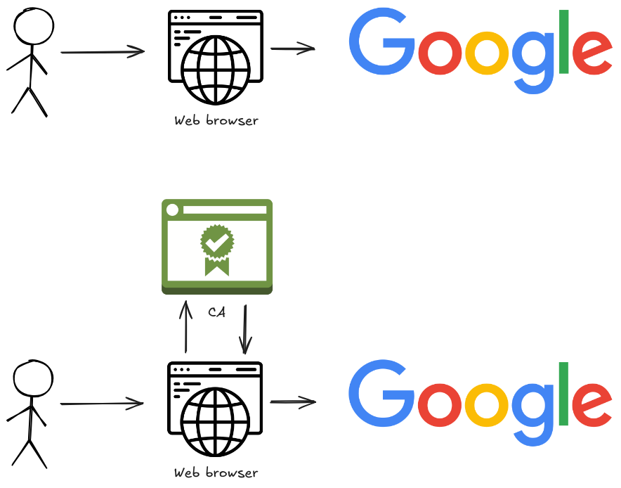 프록시 서버를 사용하지 않는 경우, 웹 브라우저는 직접 서버와 TLS 핸드셰이크를 수행하며 이 과정에서 서버가 제공하는 인증서를 전달 받는다. 브라우저는 해당 인증서가 신뢰할 수 있는 CA(Certificate Authority)에서 발급 받은 것인지 검증한다. 그렇다면 프록시 서버를 사용하면 이 과정이 어떻게 변할까?