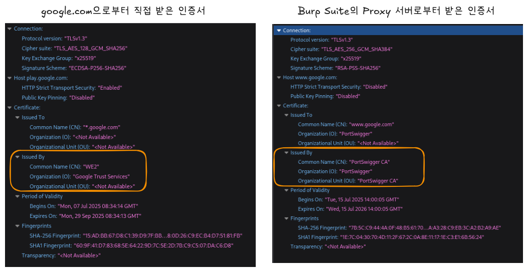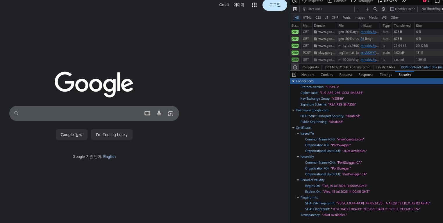 반면, Burp Suite의 프록시 서버를 거쳐 같은 요청을 보내면 브라우저가 받는 인증서는 PortSwigger CA에서 발급 받은 인증서다. 이 CA는 방금 직접 우리가 브라우저에 등록해둔 루트 인증서로 신뢰 목록에 추가했기 때문에 브라우저가 해당 인증서를 유효한 것으로 판단하고 안전하게 통신을 허용하게 된다.