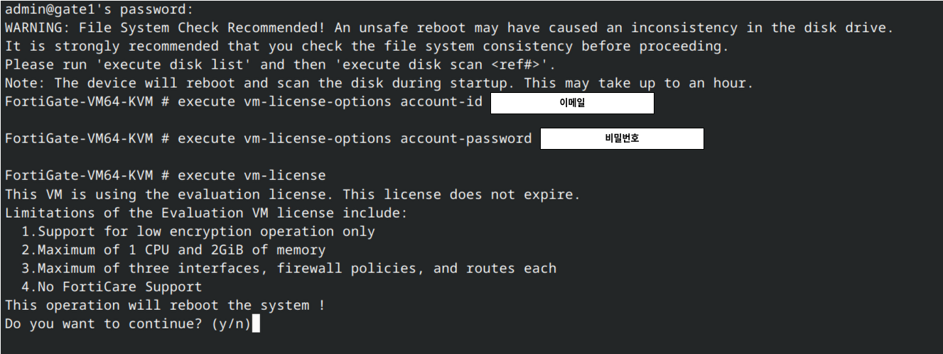 Do you want to continue?에 y를 입력하고 엔터를 치면 FortiGate가 재부팅되며 라이센스 등록이 진행된다.