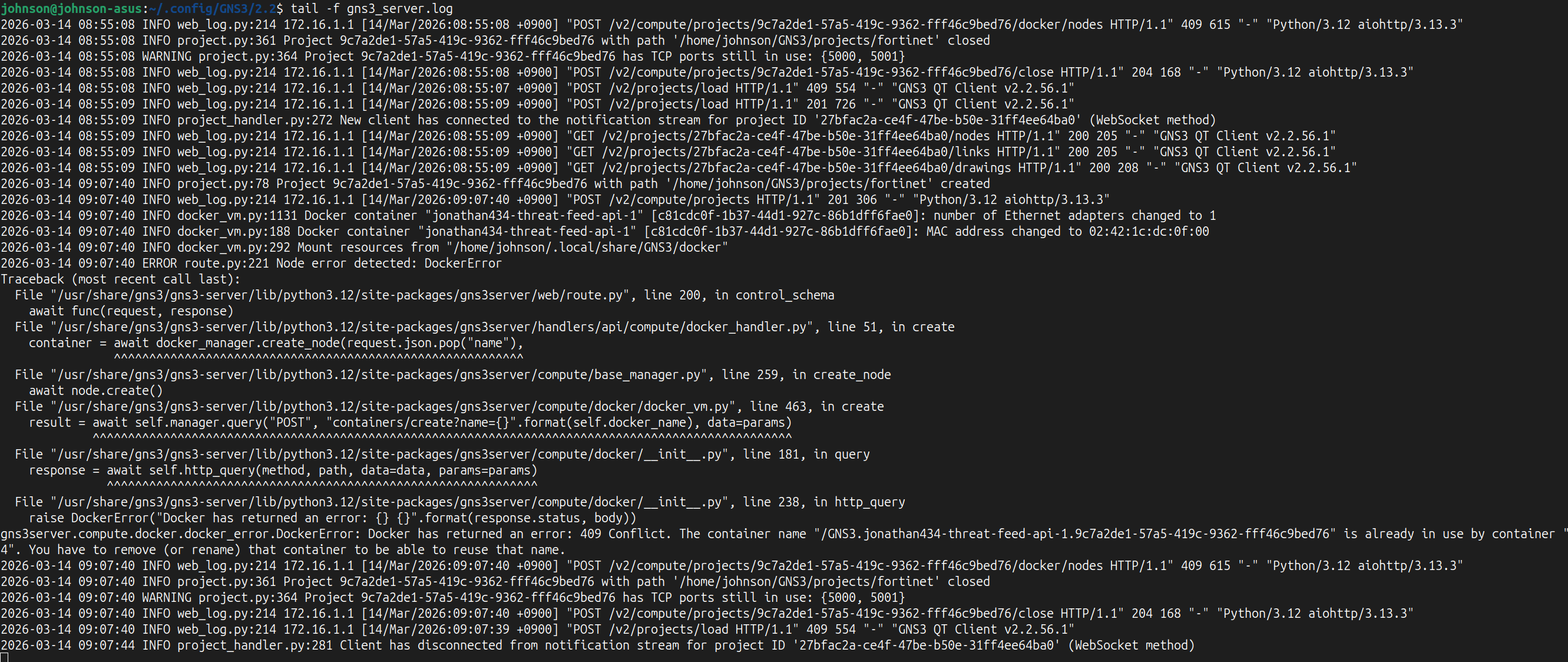 - GNS3 로그 파일을 확인하여 트러블슈팅 진행이 필요하다.