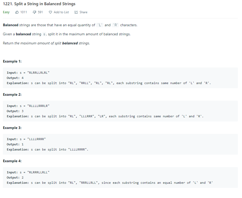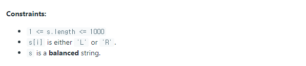 문제의 제일 중요한 조건이 Balanced strings are those that have an equal quantity of 'L' and 'R' characters.