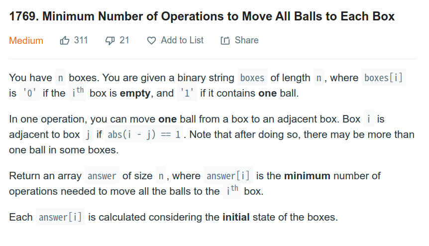 Minimum Number of Operations to Move All Balls to Each Box 본문
