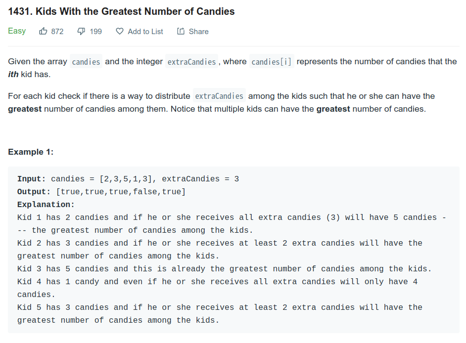 candies 배열을 한 바퀴 돌아서 최대값을 구한 후, 다시 한 번 candies 배열을 돌아서 구한 최댓값보다 큰지 확인 후 크면 true 아니면 false를 리스트에 더함.