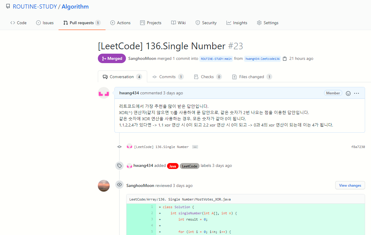 토론이 끝나고 코드가 정리가 되면 Pull Request를 받은 사람(프로젝트 원본 만든 사람 또는 merge할 권한이 있는 사람)이 Merge를 합니다.