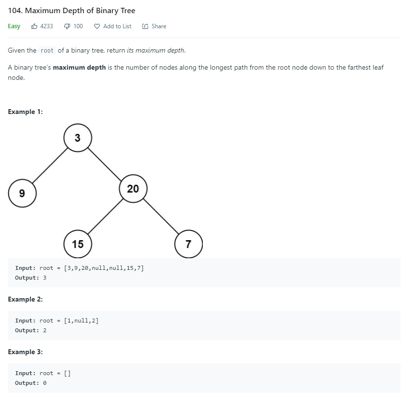 최대 깊이를 구하시오. 그림에선 3이 깊이 1이고, 9랑 20이 깊이 2, 15랑 7이 깊이 3이므로 깊이 3을 리턴하면 됨.
