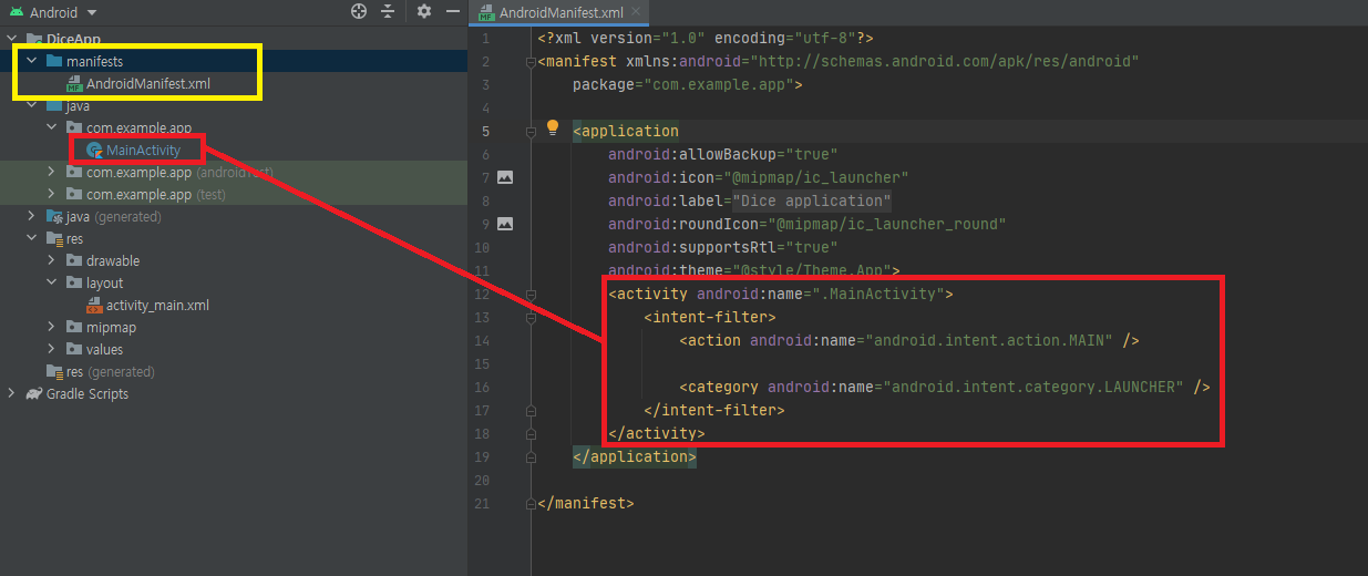 MainActivity라는 Activity가 manifest에 등록 되어 있음.