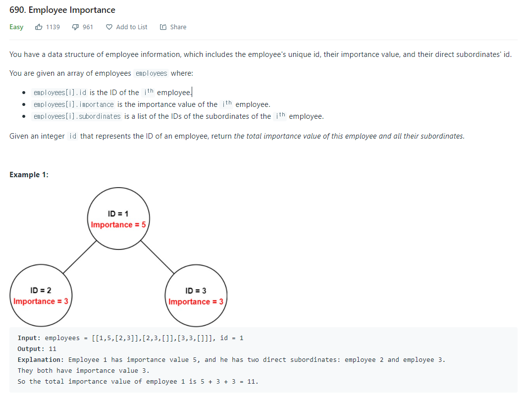 그 후에 해당 employee를 Queue에 넣고 bfs로 모든 요소를 검색한 후, 각 요소들의 중요도(importance)를 총합을 구합니다.