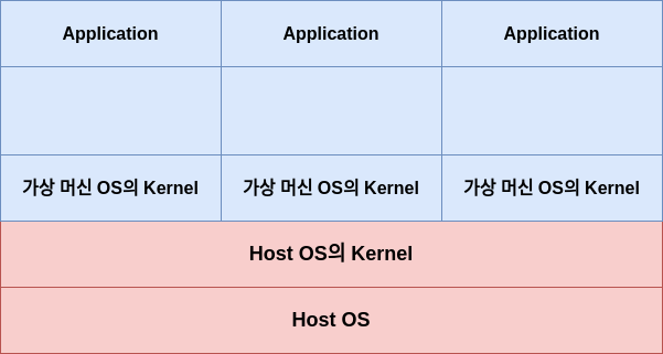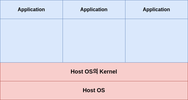 반면에, Container는 위와 같다. 컨테이너를 통해 만들어진 OS는 자신만의 커널을 가지지 않으며, 호스트 OS의 커널을 사용한다.
