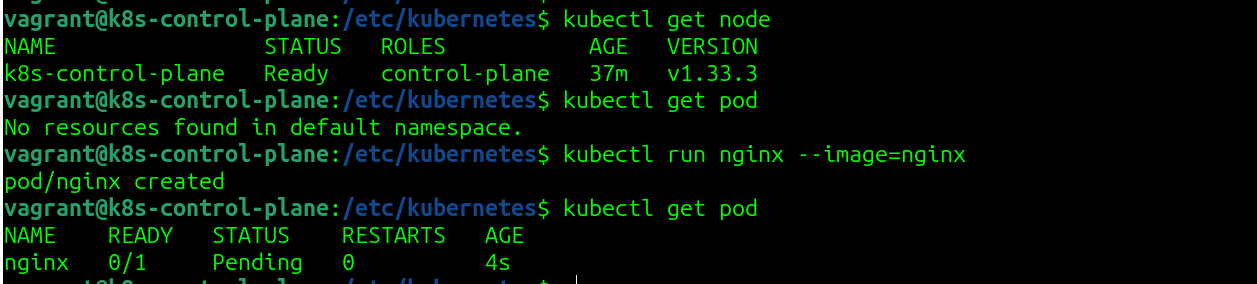 kubectl 명령어가 잘 실행된다. 현재 worker 노드가 없어 taint로 인해 nginx가 스케쥴링 되진 않는다.
